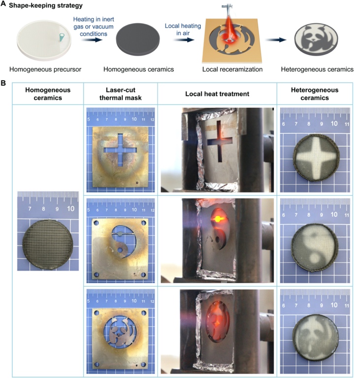 通过实验和模拟,研究者们展示了如何通过控制前体材料的热收缩率来实现异质陶瓷的形状变化,例如弯曲配置、鞍形表面和球形帽。此外,还探讨了如何通过局部加热和再陶瓷化技术来制造形状保持的异质陶瓷,例如陶瓷交叉、太极和熊猫图案。