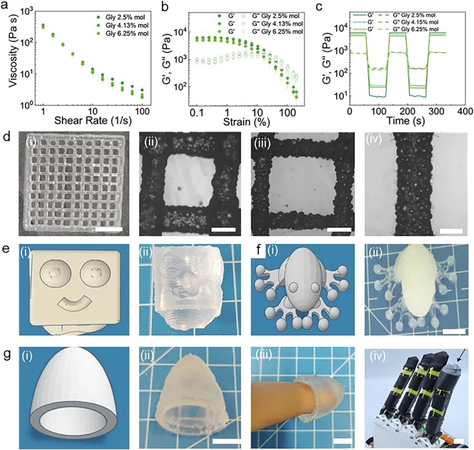 多感官选择性检测:通过离子电导率变化响应机械应变(应变系数0.22)、温度(-20°C至50°C范围内稳定)和湿度(相对湿度20%-80%敏感),并利用长短期记忆(LSTM)神经网络实现刺激分类,准确率达98%; 自修复与环境鲁棒性:受损后10秒内可恢复97%的杨氏模量,在室温下储存14天仍保持性能稳定,且抗冻、抗干燥能力显著优于传统水凝胶; 3D打印适配性:利用直接墨水书写(DIW)技术,可打印复杂3D结构如手指套、机器人外壳,厚度控制精度高,且打印后机械性能与模塑材料相当。