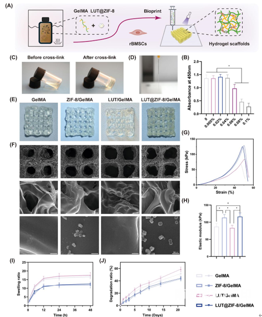 LUT@ZIF-8/GelMA生物墨水的制备流程如下:首先将50 mg苯基-2,4,6-三甲基苯甲酰基次膦酸锂(EFL,中国)溶于10 mL PBS溶液,45℃间歇搅拌15 min。随后将500 mg GelMA(EFL,中国)加入5 mL LAP溶液中,65℃避光加热15 min。灭菌后,将LUT@ZIF-8纳米颗粒悬液按1:1(v/v)与GelMA溶液混合,超声处理5 min形成均质生物墨水。使用23G针头的5 mL注射器装载生物墨水,置于3D生物打印机BM2i(Sunp,中国)中,设置打印头与平台温度分别为18-22℃和18℃,打印速度与挤出速度分别为5 mm/min和2 mm/min。405 nm波长紫外光(0.5 W/cm²)固化成型。封装rBMSCs时,将细胞以1.5×10⁶cells/mL密度混悬于生物墨水中进行打印。