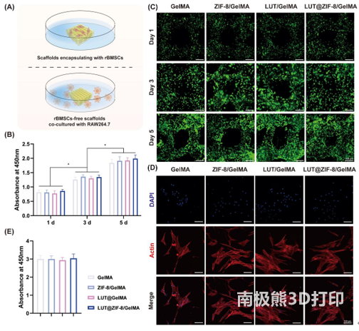 通过生物打印构建载有大鼠骨髓间充质干细胞(rBMSCs)的支架评估其细胞封装性能,同时制备空白水凝胶支架研究其对巨噬细胞增殖的影响(图5A)。CCK-8检测显示各组细胞增殖随时间显著增强,活/死染色证实细胞均匀分布且存活良好(图5B-C)。第5天TRITC-鬼笔环肽染色显示LUT@ZIF-8/GelMA组细胞伸展更显著,表明其更优的细胞扩展性能(图5D)。第7天所有组别均呈现良好细胞延展,证实水凝胶基质成功模拟细胞外基质特性。RAW264.7细胞实验表明各组支架3天内均无细胞毒性(图5E)。结果表明,LUT@ZIF-8纳米颗粒在适宜浓度下保持良好生物相容性,生物打印支架既能支持rBMSCs增殖扩展,又不影响巨噬细胞正常增殖。