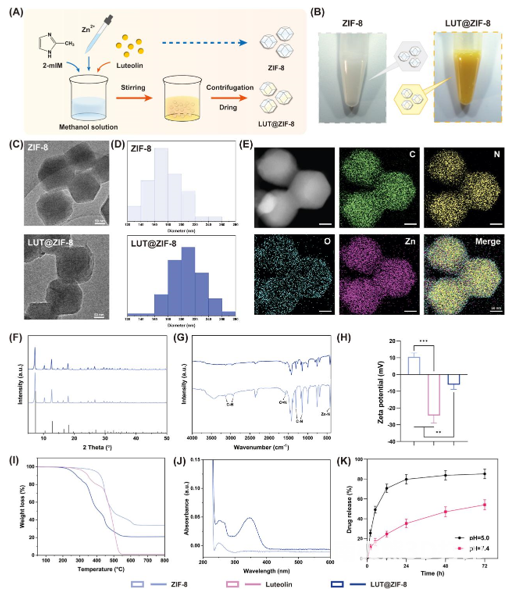 图2. ZIF-8和LUT@ZIF-8纳米颗粒的表征。