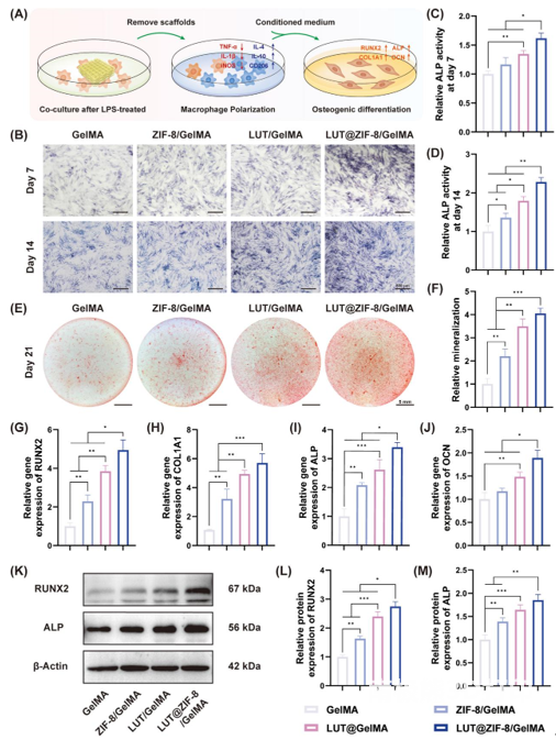 骨免疫学揭示了巨噬细胞在骨修复中的核心作用:通过直接接触或分泌外泌体调控间充质干细胞成骨分化。本研究通过构建LPS诱导的炎症微环境模型,评估LUT@ZIF-8/GelMA支架调控巨噬细胞极化对rBMSCs成骨分化的影响(图8A)。结果显示,经该支架处理的巨噬细胞条件培养基显著提升rBMSCs的ALP活性(图8B-D)及矿化结节密度(图8E-F)。RT-qPCR与Western blot证实其成骨基因(RUNX2/COL1A1/ALP/OCN)及蛋白表达均最优(图8G-M)。机制上,支架释放的木犀草素与Zn²⁺协同诱导M2型巨噬细胞极化,分泌促修复细胞因子,有效逆转炎症微环境对成骨分化的抑制作用。该研究阐明免疫调控-成骨分化级联机制,为构建免疫微环境响应型骨修复材料提供新思路。