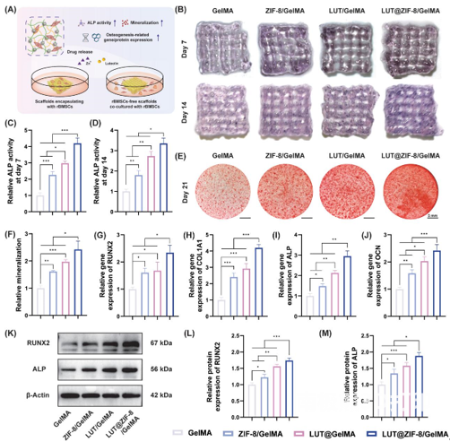 骨髓间充质干细胞(BMSCs)是骨组织工程的核心种子细胞,既能直接成骨分化,又能通过旁分泌促进组织修复。针对骨缺损区干细胞不足的问题,负载rBMSCs的支架可显著提升骨再生效果。本研究通过ALP染色、茜素红(ARS)染色及基因蛋白检测评估水凝胶支架成骨性能(图6A)。结果显示,LUT@ZIF-8/GelMA组ALP活性显著高于对照组(图6B-D),矿化结节密度与成骨基因(RUNX2/COL1A1/ALP/OCN)表达均最优(图6E-J),Western blot证实其RUNX2和ALP蛋白表达最高(图6K-M)。机制上,水凝胶内ZIF-8纳米颗粒缓释Zn²⁺维持最佳浓度,与木犀草素协同增强成骨效应。木犀草素通过Wnt通路促进成骨细胞矿化,而适量Zn²⁺可经TGF-β/PI3K-AKT通路激活BMSCs成骨分化。该研究证实LUT@ZIF-8/GelMA支架通过双因子控释体系有效促进骨再生。