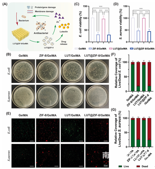 针对骨缺损常见感染风险,评估水凝胶支架对大肠杆菌和金黄色葡萄球菌的抑制作用(图4A)。菌落计数显示,LUT@ZIF-8/GelMA与ZIF-8/GelMA组显著降低菌落数量(图4B),24小时后细菌存活率分别下降至23.5%和28.7%(图4C-D)。活/死菌染色显示,含ZIF-8组红色荧光比例显著增加(图4E-G),证实其强效抗菌作用。抗菌机制归因于Zn²⁺破坏细菌细胞膜,以及木犀草素抑制DNA拓扑异构酶的双重协同效应。LUT/GelMA组因药物浓度不足仅表现微弱抗菌活性。