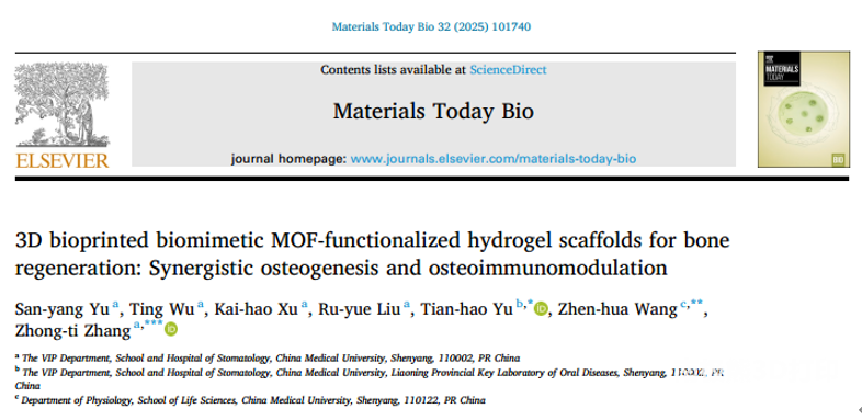 San-yang Yu, Ting Wu, Kai-hao Xu, Ru-yue Liu,Tian-hao Yu, Zhen-hua Wang, Zhong-ti Zhang, 3D bioprinted biomimetic MOF-functionalizedhydrogel scaffolds for bone regeneration: Synergistic osteogenesis andosteoimmunomodulation,Materials Today Bio,Volume 32, 2025,101740,ISSN 2590-0064, https://doi.org/10.1016/j.mtbio.2025.101740.