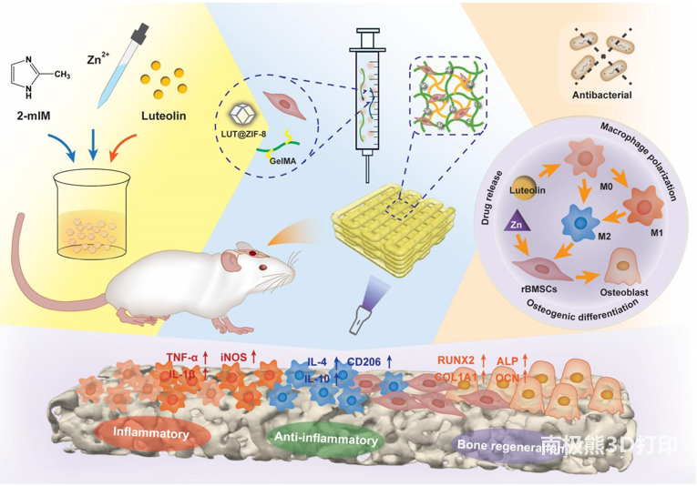 临界尺寸的骨缺损仍是一项重大的临床挑战。缺损区域缺乏具有成骨分化潜能的内源性干细胞,再加上支架植入诱发的炎症反应,突出了对可输送干细胞并具有炎症调节特性的生物材料的需求。中国医科大学张忠提团队基于3D生物打印技术,构建了负载木犀草素-ZIF-8纳米颗粒的GelMA水凝胶支架(LUT@ZIF-8/GelMA)。该文章名为“3D bioprinted biomimetic MOF-functionalized hydrogel scaffolds for bone regeneration: Synergistic osteogenesis and osteoimmunomodulation”,发表在Materials Today Bio上。该支架表现出优异的物理性能和生物相容性。LUT@ZIF-8纳米颗粒中木犀草素和锌离子的持续释放赋予了其抗菌、成骨诱导和炎症调控作用。LUT@ZIF-8/GelMA水凝胶支架调控的免疫微环境促进了BMSCs的成骨分化。此外,体内实验证实了LUT@ZIF-8/GelMA水凝胶支架的成骨和炎症调控能力。总之,这种3D生物打印的LUT@ZIF-8/GelMA水凝胶支架具有骨免疫调节特性,为骨缺损的治疗提供了一种有前景的策略。