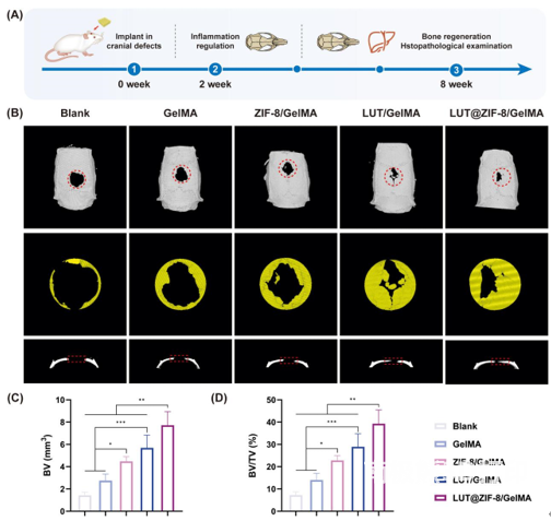 图1. 用于骨再生的LUT@ZIF-8/GelMA生物打印支架的示意图。