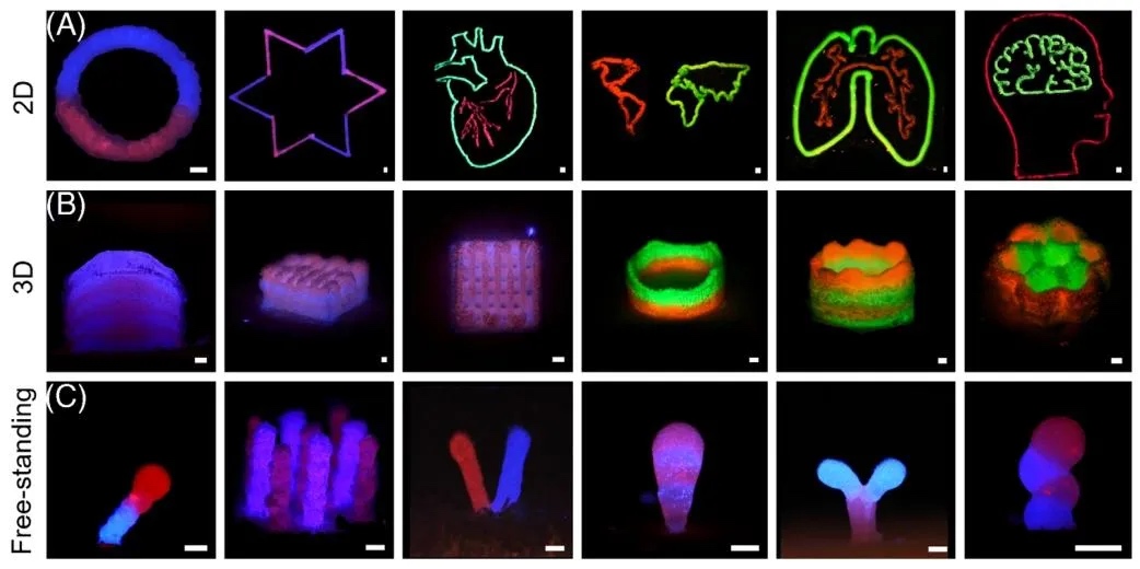 5. 多材料空间异质性结构打印图,利用双微阀系统加载荧光染料标记的GelMA,研究了多材料分层打印的可行性。结果表明,低温冻结可防止不同材料混合,成功打印交替层状网格结构,界面清晰无扩散;进一步构建MCF-7肿瘤细胞与HUVEC血管内皮细胞的共培养模型,证明两种细胞在21天内保持空间分隔并正常增殖,验证了模拟复杂组织微环境的能力。