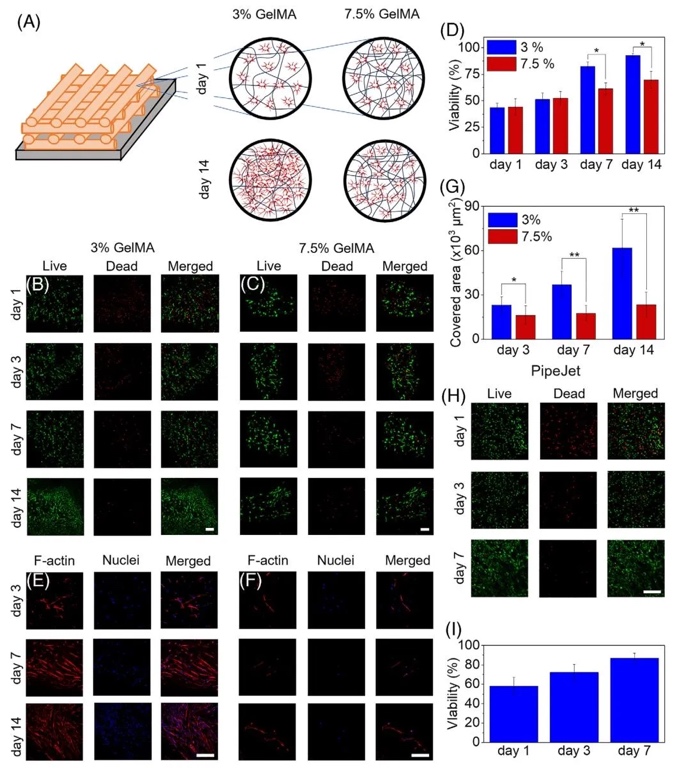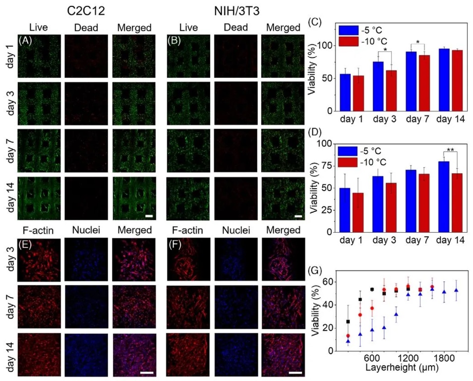 3. 细胞封装存活率与形态演变图,通过活/死染色(Calcein-AM/PI)和免疫荧光染色(F-actin/DAPI),研究了C2C12肌细胞、NIH/3T3成纤维细胞在-5℃/-10℃打印后的存活与增殖行为。结果表明,初始存活率约50%,培养14天后升至80%-90%,细胞呈扩散生长并形成互连网络;星形胶质细胞在3%低浓度GelMA中铺展面积更大(14天达初始3倍),但结构稳定性随浓度降低而下降,提示需平衡细胞活性与力学性能。
