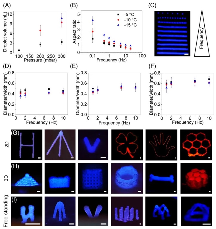 2. 液滴尺寸与打印高宽比量化分析图,利用光学成像系统(SmartDrop)和流变仪,研究了压力、阀门开启时间(500-700 µs)及打印频率(0.1-20 Hz)对液滴体积和结构高宽比的影响。结果显示,低压力(100 mbar)与短开启时间(500 µs)产生最小液滴(0.8 nL),低温板温度越低(如-15℃)、频率越低(如0.1 Hz),结构高宽比越高(>4),且冻结后水凝胶储存模量从室温的0.01 Pa·s跃升至50 Pa·s以上,揭示了低温通过增强材料弹性维持打印结构稳定性的机制。