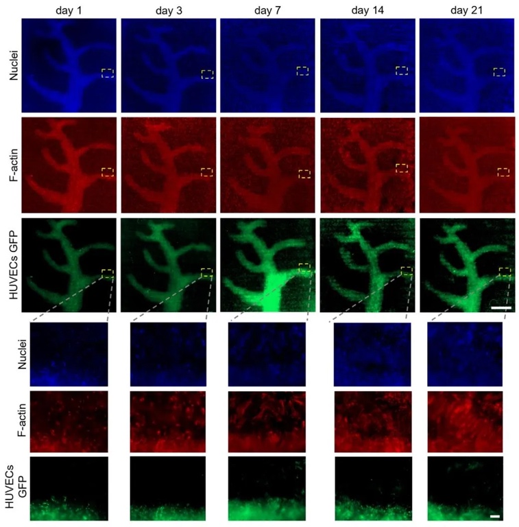 6. 血管化乳腺癌模型共培养表征图,通过分层打印两层MCF-7细胞(2.5×10⁶ cells/mL)与两层GFP标记HUVECs(5×10⁶ cells/mL),研究了多细胞类型的空间分布与相互作用。结果显示,HUVECs在肿瘤细胞层上方形成血管样结构,培养21天后交界处可见内皮细胞向肿瘤细胞方向萌芽,两组细胞存活率分别达90%和80%,证实该技术在构建血管化肿瘤模型中的应用潜力。