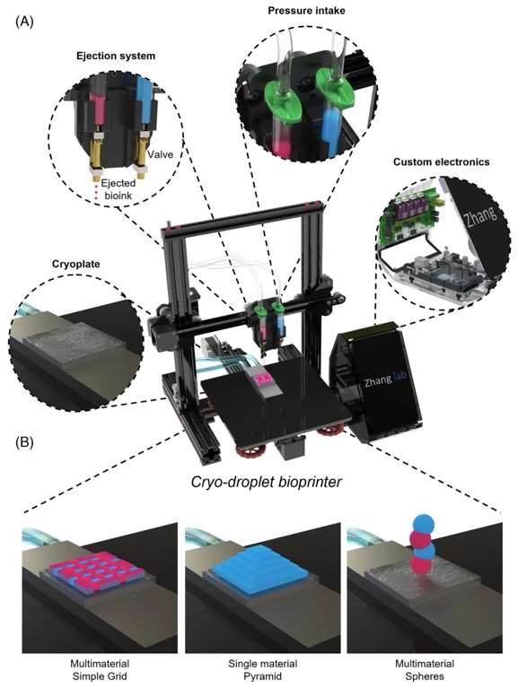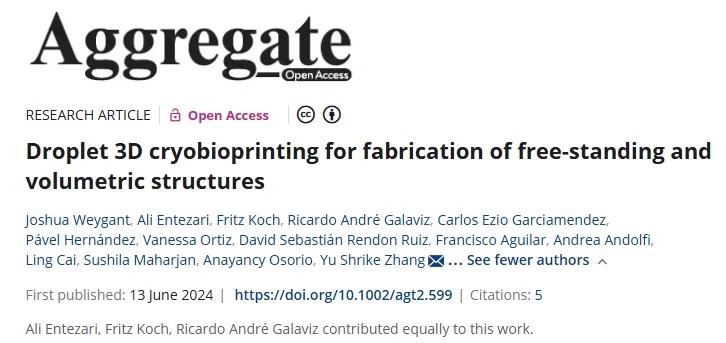 在组织工程与再生医学领域,液滴生物打印技术因具有高分辨率、非接触式操作等优势而备受关注,但其依赖低黏度生物墨水,导致打印结构缺乏自支撑性,难以构建复杂3D立体结构,且多材料图案化需繁琐的层间交联步骤,限制了应用场景。来自哈佛医学院的Yu Shrike Zhang教授团队开发了一种液滴3D低温生物打印技术,通过将液滴打印与低温打印结合,利用低温板(-5至-15℃)使低黏度生物墨水(如7.5% GelMA)在沉积后立即冻结,无需额外支撑即可形成自立式结构,同时避免多材料混合问题。该技术成功打印出金字塔、多层网格及字母“H”“V”等单材料或多材料复杂结构,并实现了C2C12肌成纤维细胞、NIH/3T3成纤维细胞等多种细胞的封装,细胞存活率在培养2-3周后达80%-90%,还构建了血管化乳腺癌模型验证多细胞共培养潜力。相关工作以“Droplet 3D cryobioprinting for fabrication of free﹕tanding and volumetric structures”为题发表在《Aggregate》上。