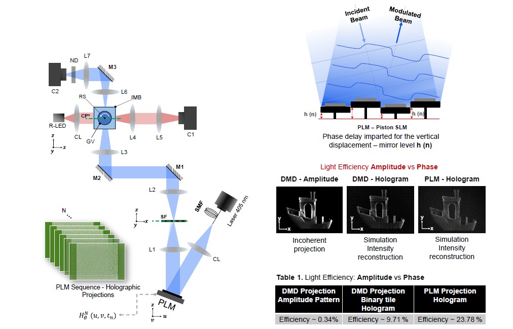 传统的TVAM系统通常依赖于数字微镜器件(DMD),这是一种光效率有限的二进制振幅调制器,通常低于10%。EPFL团队将其替换为仅相位的相位光调制器(PLM),从而实现精确的波前控制。这一改进使测得的光效率达到23.78%,比DMD提高了70倍,同时还减少了散斑噪声等成像伪影。