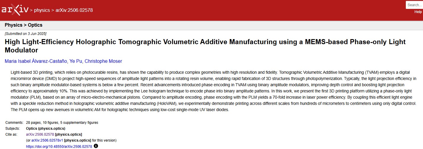 他们的研究成果以题为“High Light-EfficiencyHolographic Tomographic Volumetric Additive Manufacturing using a MEMS-basedPhase-only Light Modulator”的论文发表在在线期刊arXiv (2025 年 6 月),详细展示了相位调制如何彻底改变基于光的制造技术,从而实现更快、更高分辨率的打印,并实现前所未有的能源效率。