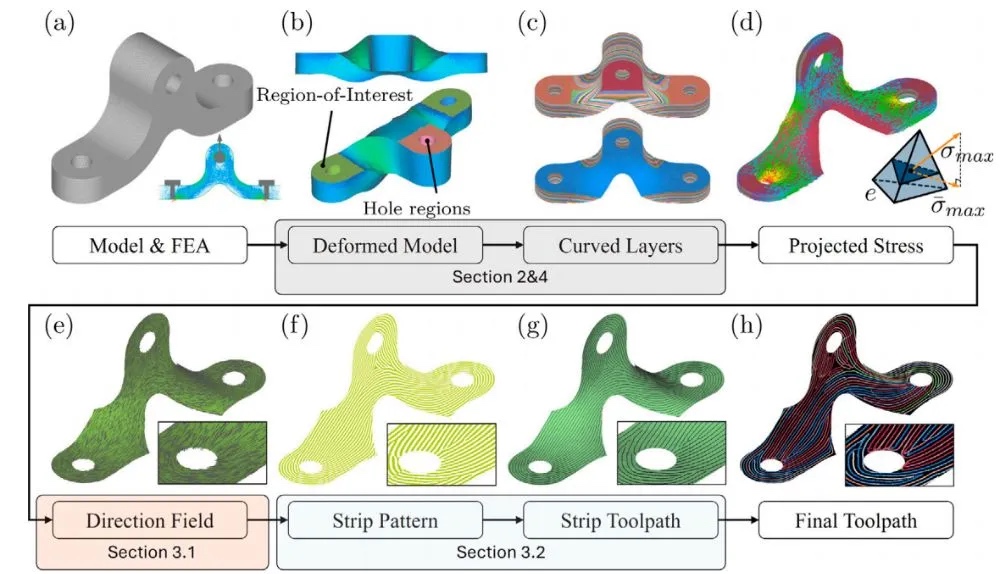 近日,Composites Part B 期刊发表了一篇由曼彻斯特大学机械与航空航天工程系研究团队完成的有关连续纤维增强热塑性复合材料(Continuous Fiber-Reinforced Thermoplastic Composites, CFRTP)增材制造的研究成果。该研究提出了一种基于主应力引导的高密度纤维路径生成方法,通过优化方向场和周期性标量场生成等距纤维路径,有效克服了现有方法在纤维覆盖密度和方向一致性上的局限性。论文标题为“Toolpath generation for high density spatial fiber printing guided by principal stresses”。