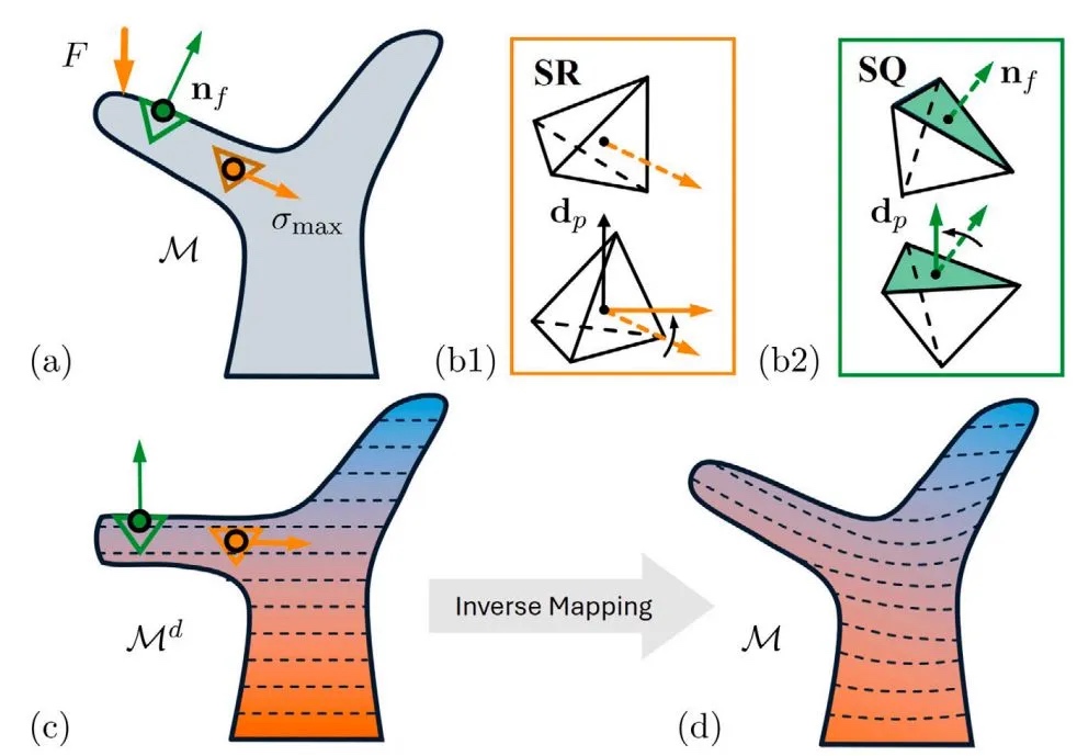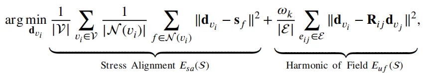 1. 方向场优化:采用2-RoSy(2旋转对称)表示消除主应力方向模糊性。通过局部坐标系定义和邻域旋转矩阵,将方向场与主应力对齐,并最小化场的不连续性。