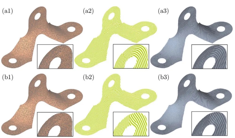 2. 周期性标量场生成:将方向场转换为周期性标量场,利用旋转形式(Spinning Form)提取等值线作为路径。通过Marching Squares算法生成初始路径后,研究人员剔除短路径并处理奇异点,确保路径连续性和制造可行性。
