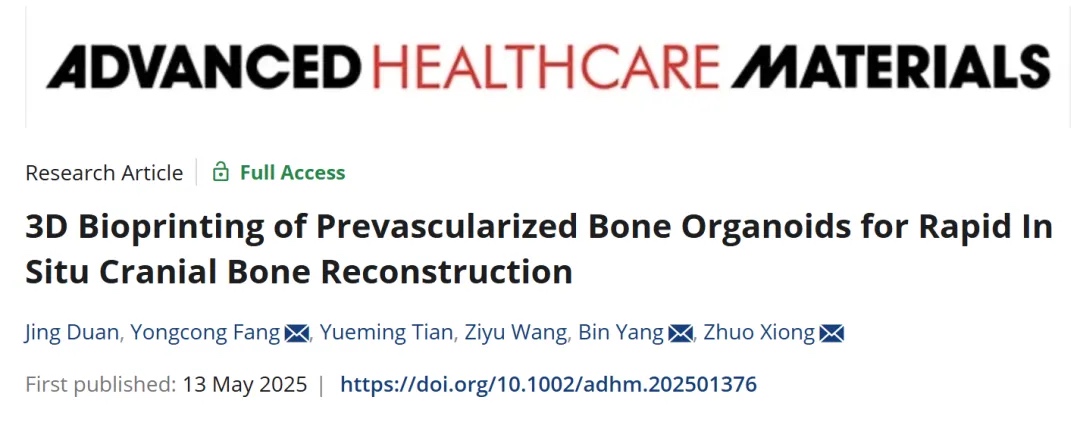 相关工作以“3D Bioprinting of Prevascularized Bone Organoids for Rapid In Situ Cranial Bone Reconstruction”为题发表在《Advanced Healthcare Materials》上。北京协和医学院2022级整形外科博士生段婧为第一作者,清华大学熊卓教授、方永聪助理教授及协和医学院杨斌教授为共同通讯作者。