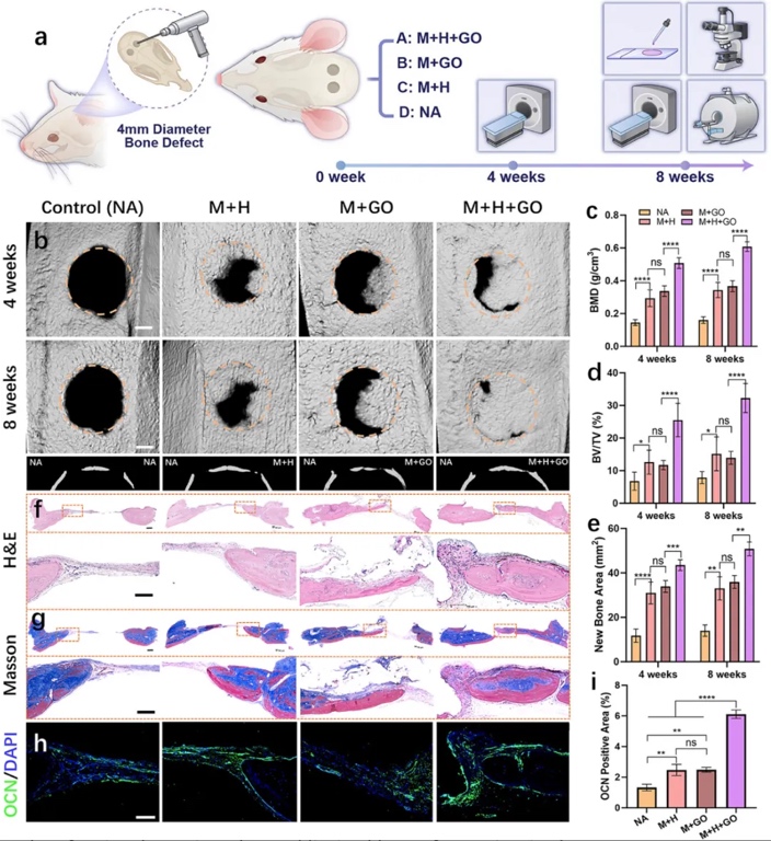 6. 颅骨缺损修复的体内效果评估。在大鼠颅骨缺损模型中植入不同处理的生物打印 construct,通过显微CT、组织学染色(H&E、Masson三色)及免疫荧光染色评估骨再生与血管化。结果表明,含GO与内皮细胞的预血管化骨类器官组(M+H+GO)新骨覆盖率、骨体积分数(BV/TV=32.28±4.48%)及血管密度显著高于其他组,且促进M2型巨噬细胞极化,证实其高效的原位骨再生与抗炎能力。