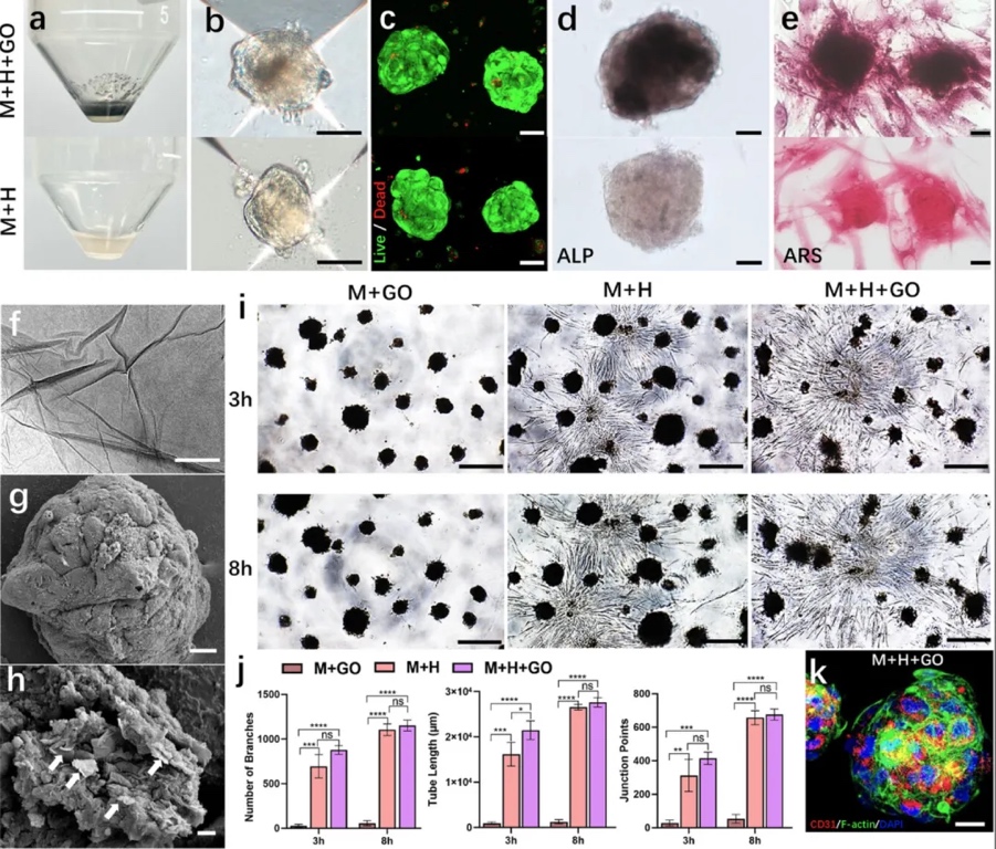 2. 预血管化成骨聚集体的表征与优化。采用强制聚集技术制备含不同成骨微颗粒(羟基磷灰石、生物玻璃、石墨烯氧化物等)的细胞聚集体,通过实时定量PCR、免疫荧光染色等方法评估成骨基因表达与细胞活性。结果表明,石墨烯氧化物(GO)组的成骨相关基因(如ALP、COL-1、Runx-2)表达显著高于其他组,且细胞相容性良好,证实GO对成骨分化的促进作用最优。