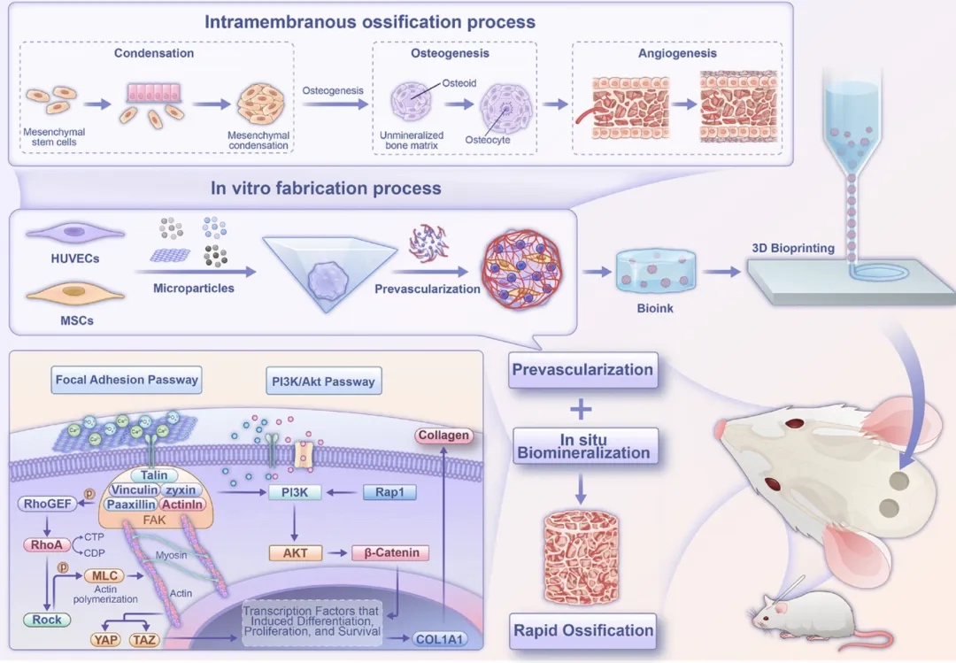 为解决上述问题,清华大学熊卓、方永聪课题组与北京协和医学院杨斌课题组合作,提出一种新型发育工程策略,将间充质干细胞(MSCs)、人脐静脉内皮细胞(HUVECs)与成骨微颗粒结合,大规模构建具有自组织血管化和成骨特性的预血管化骨类器官。团队系统筛选出石墨烯氧化物(GO)作为最优成骨微颗粒,其通过粘着斑和PI3K/Akt通路显著促进成骨分化。进一步将类器官负载于明胶甲基丙烯酰酯(GelMA)水凝胶中进行3D生物打印,构建具有高细胞密度和成骨能力的复杂组织构建体。体内实验证实,该方法可促进快速血管化骨组织形成,实现颅骨缺损的有效原位再生修复。