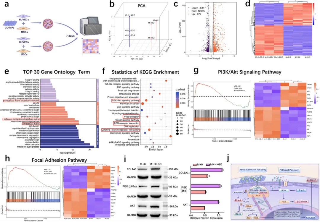 4. GO促进成骨分化的分子机制转录组分析。通过mRNA测序与生物信息学分析,研究GO影响成骨的分子通路。结果显示,GO组差异表达基因富集于粘着斑、PI3K/Akt信号通路等,Western blot验证PI3K、AKT等蛋白表达上调,证实GO通过激活粘着斑和PI3K/Akt通路促进成骨分化与细胞外基质合成。