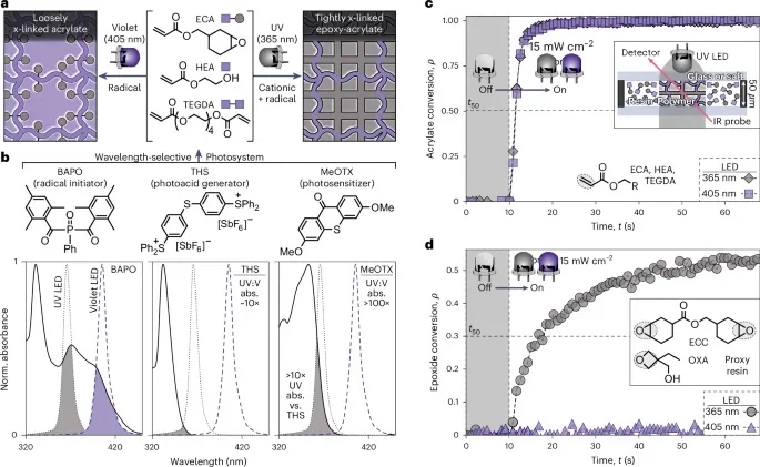 开发了一种混合丙烯酸酯-环氧单体ECA((3,4-环氧环己基)甲基丙烯酸酯),通过波长选择性光固化,实现多材料3D打印(图2a)。ECA结合了环氧基高反应性和丙烯酸酯的良好加工性,能通过紫外光和可见光分别驱动不同化学反应,增强硬软材料界面结合。为优化光敏体系,筛选了多种光酸发生剂和光引发剂,最终选用BAPO作为紫光引发剂,THS与新开发的MeOTX作为高选择性的紫外光助敏剂(图2b),大幅提升了紫外区环氧固化速率。通过红外实时光谱监测,团队优化了树脂配方,加入HEA和TEGDA调整粘度和机械性能,在365/405nm光源下,混合树脂能在几秒内快速固化(图2c、2d),满足DLP 3D打印对速度和力学性能的需求。