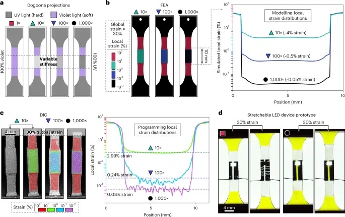 为了验证该多材料3D打印系统在可拉伸电子器件中的应用潜力,设计了具备超高刚度对比度(ΔE超过1000倍)和高弹性的多材料结构(图6)。通过有限元分析(FEA)和数字图像相关技术(DIC),他们测试了中心嵌有不同刚度材料(约1、10、100和1000MPa)的标准拉伸样条,在整体30%拉伸下的局部应变情况(图6a)。结果表明,随着嵌入材料刚度的提高,局部应变显著降低,FEA预测分别为约4%、0.5%和0.05%,实验数据与之基本吻合(图6b,c)。尤其在1000倍刚度对比度下,局部变形远低于硅材料的断裂阈值(0.5%),这对于保护可穿戴电子器件非常重要。进一步,作者在不同刚度插入区域表面镀上金层,并连接LED灯,进行拉伸测试(图6d)。结果显示,低刚度(1×)样品在30%拉伸下断裂,LED熄灭,而高刚度(1000×)样品保持完好,LED正常工作。中间刚度(10×和100×)样品的电阻随拉伸变化也明显减小,表明电子稳定性提升。