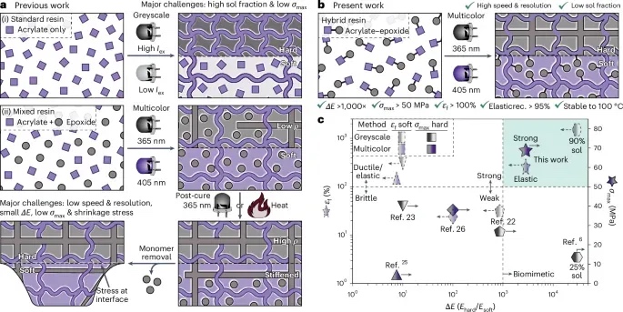 自然界中,硬材料和软材料常常被巧妙组合,形成既坚固又柔韧的复杂结构,这也是科学家试图用3D打印技术仿生的方向。然而,目前多材料3D打印还面临不少难题,比如打印速度慢、材料性能不稳定、硬软材料之间界面脆弱等。灰度光固化和多色光固化是两种常见方案,前者通过控制光强调节局部硬度,虽然强度差异大,但软性区域易残留未反应单体,影响稳定性;后者通过不同颜色光驱动不同化学反应,能精准控制材料组合,但普遍存在打印速度慢、材料强度不足、界面易脆化的问题。因此,想要实现打印速度快、硬软强度差异大、力学性能可调、结构稳定的高性能多材料3D打印,仍需要在材料配方和打印工艺上进一步创新(图1a)。