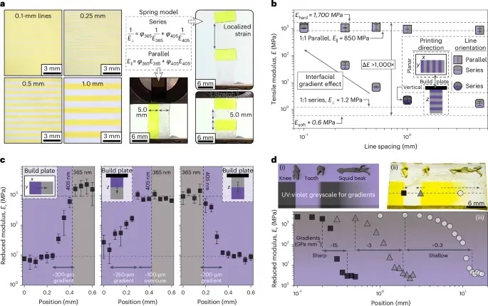 通过颜色对比、拉伸测试和纳米压痕,系统评估了多材料3D打印结构的分辨率和力学性能。结果表明,交替打印的硬和软材料线条在光学显微镜下可清晰分辨至0.25mm(图4a)。进一步拉伸测试显示,1:1硬软比例下,样品在不同排列方向上与理论模型吻合良好,1mm线宽时实验弹性模量分别为956MPa(E∥)和2.2MPa(E⊥)(图4b)。但当线宽减小至0.1mm时,由于紫外光“过固化”效应,模量升高并趋近硬材料水平。通过纳米压痕测试,详细描绘了软硬材料界面的梯度变化,发现横向梯度范围约200µm,竖直方向上硬材料直接打印在软材料上时,梯度范围扩大至250µm,主要因光散射、酸扩散及环氧树脂放热固化影响(图4c)。为模拟自然界如膝盖、牙齿、乌贼喙等结构中的不同梯度界面,开发了多色灰度DLP打印方法,通过调整UV和紫光的照射强度比例,实现了微米到厘米级的力学梯度可控过渡(图4d),材料弹性模量跨度达1000倍。这种技术为高精度、多功能的仿生多材料结构制造提供了重要途径。