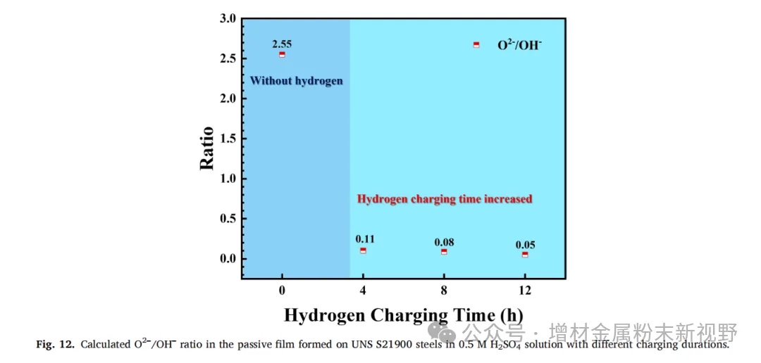 • O²⁻/OH⁻ 比例从2.25降至0.05,表明金属氧化物减少、氢氧化物主导 → 被动膜疏松