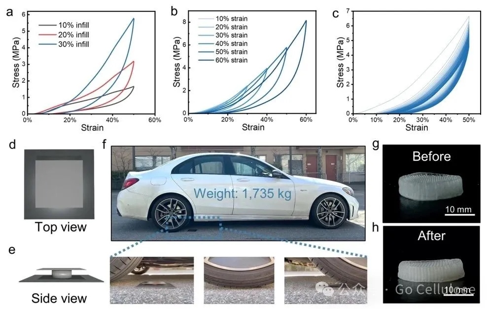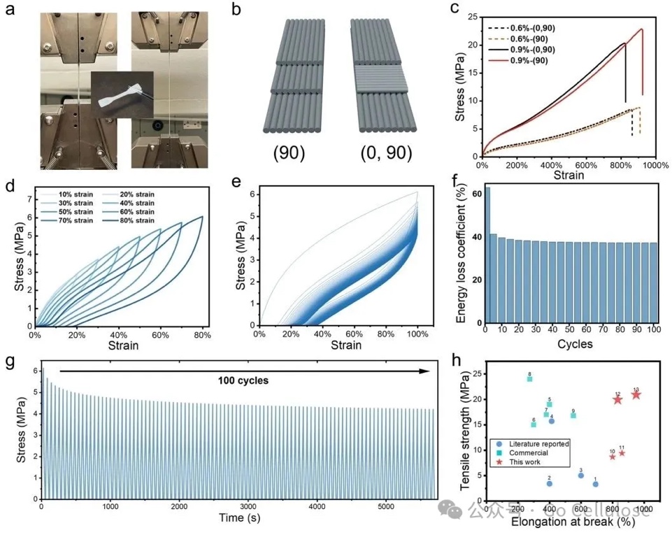 填充密度30%的样品抗压强度达5.75 MPa(50%应变),100次循环后应力衰减轻微(图4a-c)。极端测试中,0.9% CNF支架被1.7吨汽车碾压后仅7.5%永久形变(图4d-h)。0.9% CNF样品展现超高延展性(断裂伸长率951%)和强度(极限抗拉强度22 MPa)(图5c)。平行堆叠样品(层间方向一致)性能优于交叉堆叠。100次拉伸循环(100%应变)后能量损耗系数稳定在41.5%,表明优异耐疲劳性(图5e-g)。对比文献数据,其综合机械性能远超现有3D打印聚氨酯材料(图5h)。