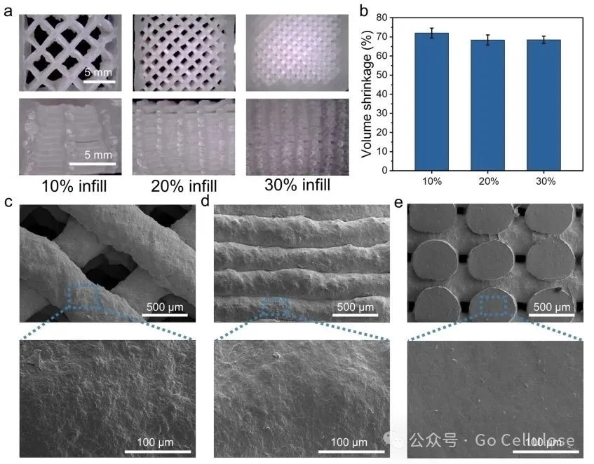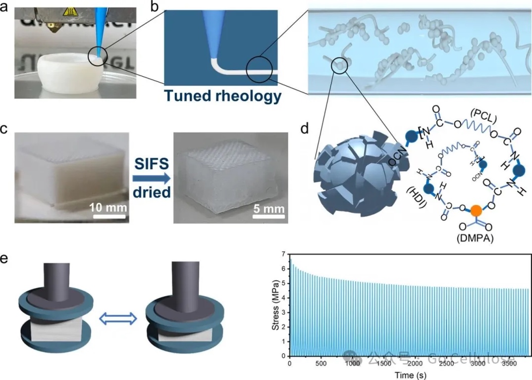 在聚氨酯预聚物中添加水性CNF悬浮液形成乳液,利用CNF与WPU液滴构建的"串珠结构"调控墨水流变性(图1b),实现打印自支撑性;随后创新采用SIFS技术——打印后浸入丙酮破乳,破坏WPU乳液纳米颗粒,促使聚氨酯预聚物暴露、交联并致密化(图1d),同步引发70%体积收缩及材料半透明化(图1c),此过程因打印路径的纤维定向产生各向异性收缩(垂直收缩35%>横向30%);最后经室温风干获得高弹性致密结构,可承受超100次压缩循环(图1e)。