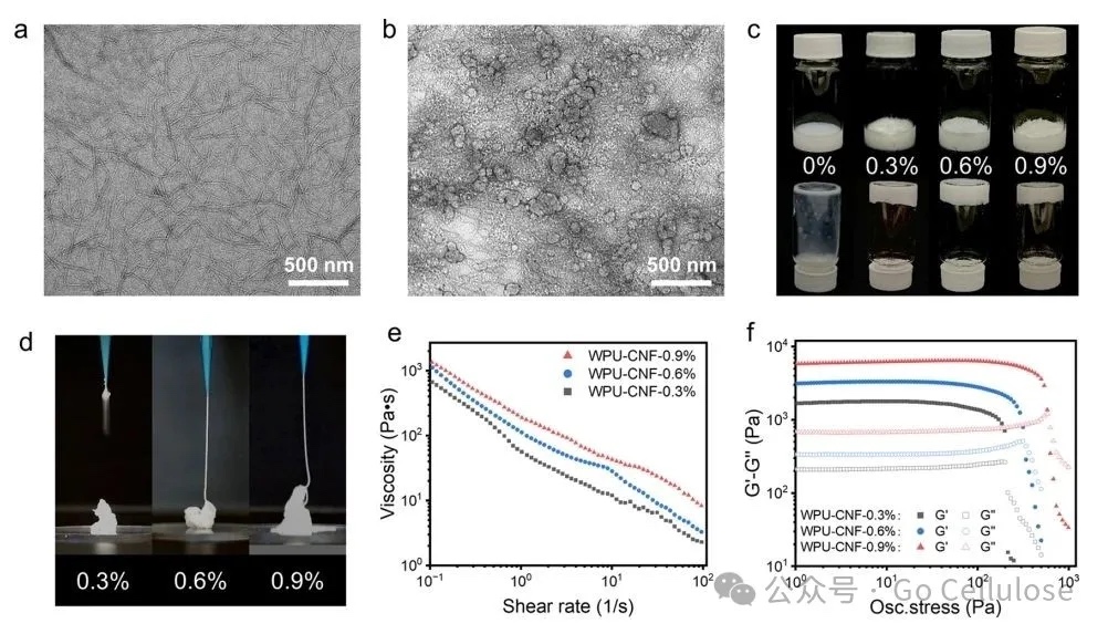 聚氨酯弹性体因优异的弹性、可调机械性能和生物相容性,广泛应用于鞋类、软体机器人和医疗敷料等领域。然而,现有主流技术如熔融沉积成型依赖高温加工,仅适用于热塑性聚氨酯,限制了添加剂的选择且制品耐溶剂/热性差;光固化需使用有毒光引发剂和光敏预聚体,材料选择范围窄且成本高。二者均难以兼顾复杂结构定制与环境友好性。直写成型(DIW)技术虽可在室温下操作并兼容多功能添加剂,但工业水性聚氨酯(WPU)因流变性能不足无法直接用于DIW打印。尽管纤维素纳米纤丝(CNF)等流变改性剂已被用于制备DIW墨水,但现有研究多聚焦多孔支架,未能保留聚氨酯的高弹性特性。因此,开发一种基于WPU的DIW墨水,实现高弹性、一体化结构的室温打印,对拓展聚氨酯在定制化领域的应用具有重要意义。
