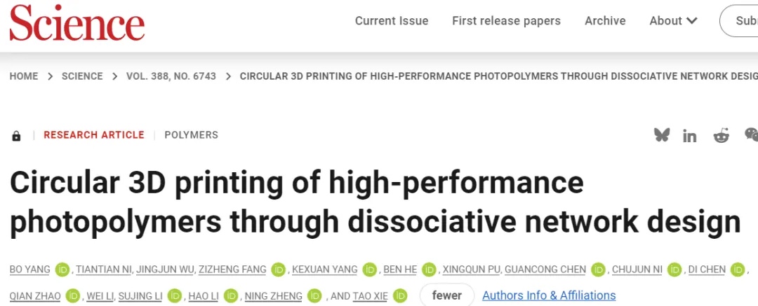 2025年3月,浙江大学谢涛教授团队在《Science》上发表了关于闭环可回收光敏聚合物的突破性研究,题目为Circular 3D printing of high-performance photopolymers through dissociative network design。