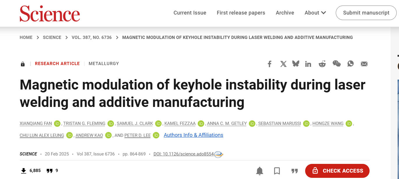 2025年2月,由伦敦大学机械工程学院材料主导的国际研究团队发表了关于"Magnetic modulation of keyhole instability during laser welding and additive manufacturing 激光焊接与增材制造过程中匙孔不稳定性的磁调控"的研究。