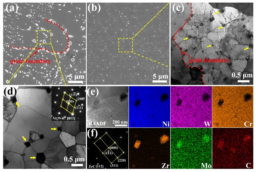 (a,b) 热处理后原始和Zr改性Haynes 230样品的SEM图像概览。(c)TEM图像显示纳米析出相在胞和晶界均匀分布。(d)TEM图像显示(a)中晶界析出相的详细微观结构。(e)Ni、W、Cr、Zr、Mo和C的EDS图谱。(f)(c)中标记的ZrC颗粒的SAED图样。