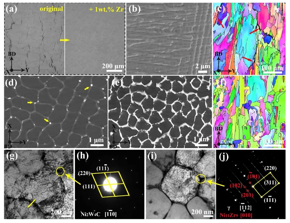 (a) 沿构建方向(BD)的原始(0 wt.% Zr)和Zr改性Haynes 230(1 wt.% Zr)样品的光学显微镜(OM)图像。(b)断口胞界特征证实原始样品存在热裂纹。原始Haynes 230样品的微观结构特征: