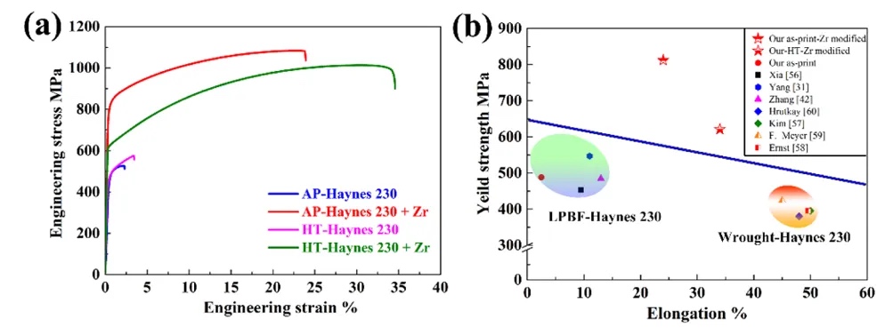 (a) 打印态和热处理后Zr改性及原始Haynes 230合金的工程应力-应变曲线。(b)LPBF制造的Haynes 230合金、先前报道的锻造Haynes 230合金及本研究中样品的屈服强度-延伸率数据总结。