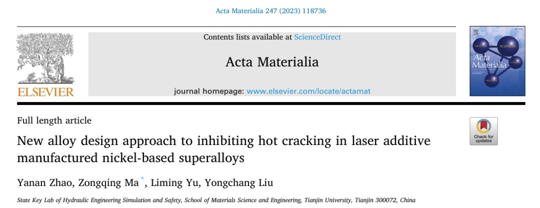 Zhao, Y., Ma, Z., Yu, L., & Liu, Y. (2023). New alloy design approach to inhibiting hot cracking in laser additive manufactured nickel-based superalloys. Acta Materialia. https://doi.org/10.1016/j.actamat.2023.118736