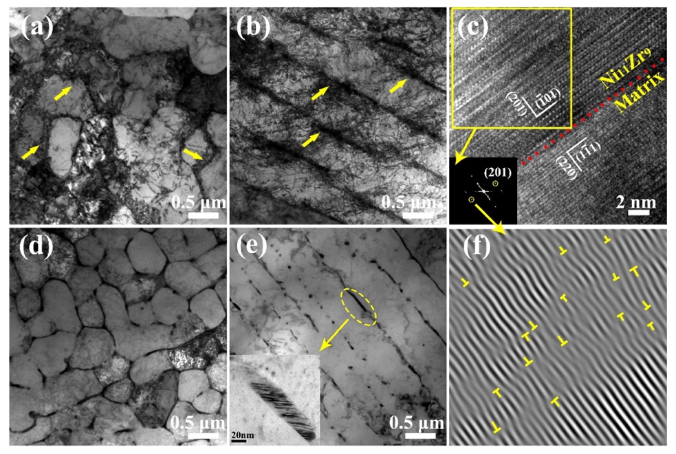(a) 打印态样品中位错在Ni₁₁Zr₉界面堆积;