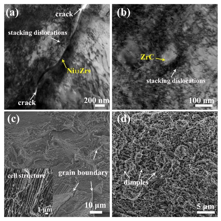 TEM和SEM图像显示Zr改性Haynes 230样品拉伸变形后的微观特征:
