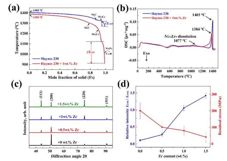 (a) 原始和Zr改性Haynes 230合金的Scheil-Gulliver凝固曲线。(b)原始和Zr改性Haynes 230合金在30°C至1450°C加热过程中的差示扫描量热法(DSC)结果。(c)不同Zr含量打印样品的X射线衍射(XRD)图谱。(d)样品XRD(220)和(200)衍射峰强度比随Zr含量的变化关系。插图提供通过sin²ψ法计算的残余应力值。