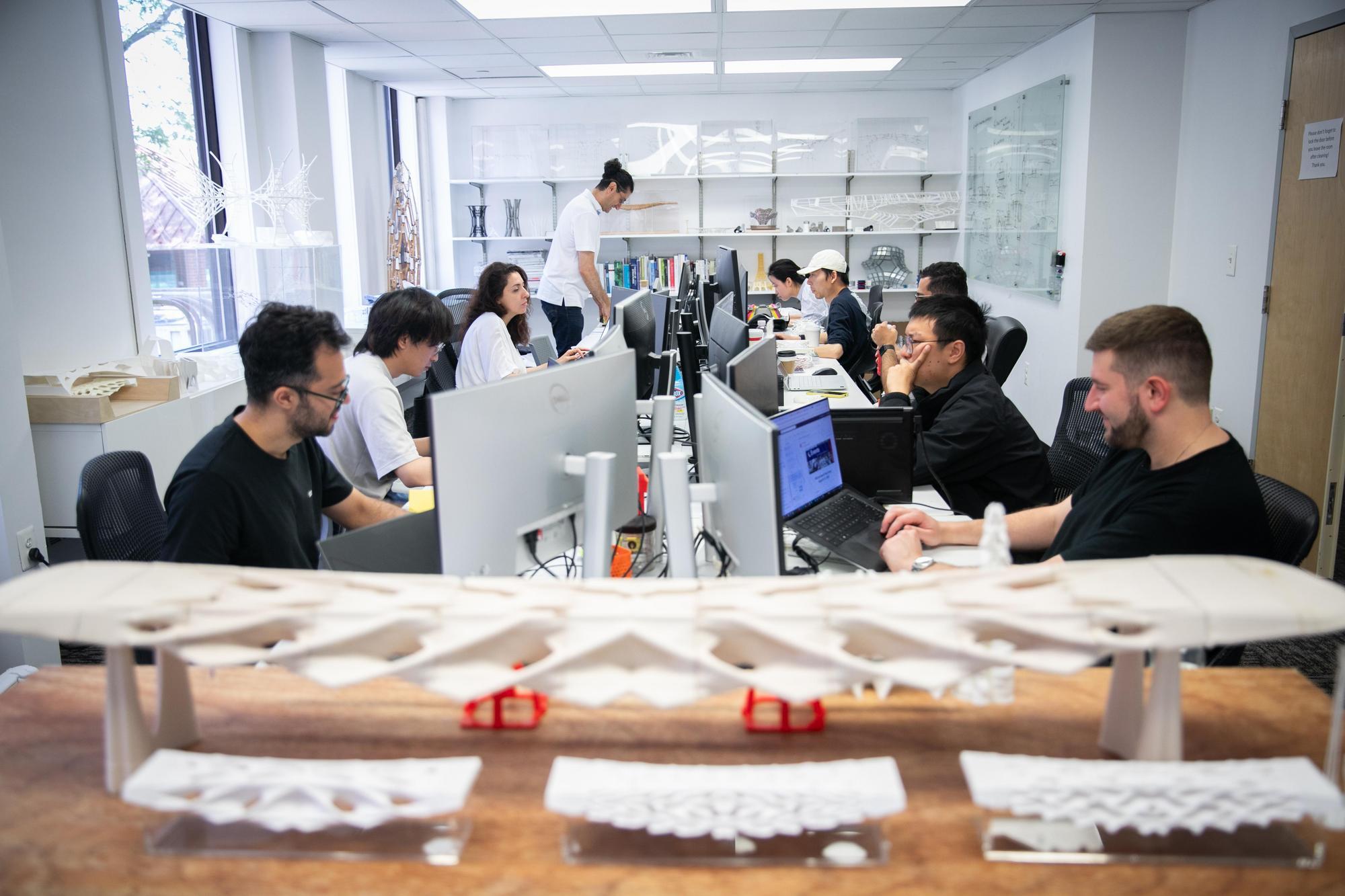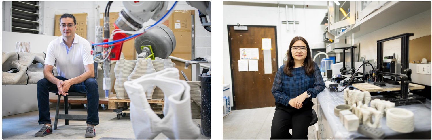 △研究人员:(左)马苏德·阿克巴扎德 (Masoud Akbarzadeh) 是威兹曼设计学院的建筑学副教授,也是宾夕法尼亚大学多面体结构实验室的主任。(右)杨舒是约瑟夫·博尔多尼亚工程与应用科学教授,也是工程与应用科学学院材料科学系的主任。
