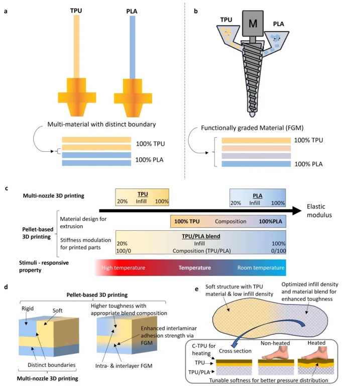多材料颗粒3D打印技术(FGF)因可利用商业聚合物颗粒和添加剂制造多功能模型而备受关注,但其界面性能研究有限,如聚合物比例对界面强度和结合的影响。传统多喷嘴3D打印通过填充设计调节材料性能的范围受限,且材料脆性随填充密度降低而增加。来自新加坡南洋理工大学的Wai Yee Yeong教授和新加坡制造技术研究所的Mui Ling Sharon Nai教授团队合作,利用多材料FGF技术对PLA和TPU进行原位共混,系统研究了5种PLA/TPU比例下的机械和热性能,优化3D打印参数,使界面剪切强度提升约320%,还通过添加炭黑增强TPU导电性,开发出兼具加热功能和刺激响应特性的多功能鞋垫。相关工作以“Exploring PLA/TPU blends in pellet-based printing for multifunctional applications: Blending and interfacial properties”为题发表在《Materials Science & Engineering R》上。