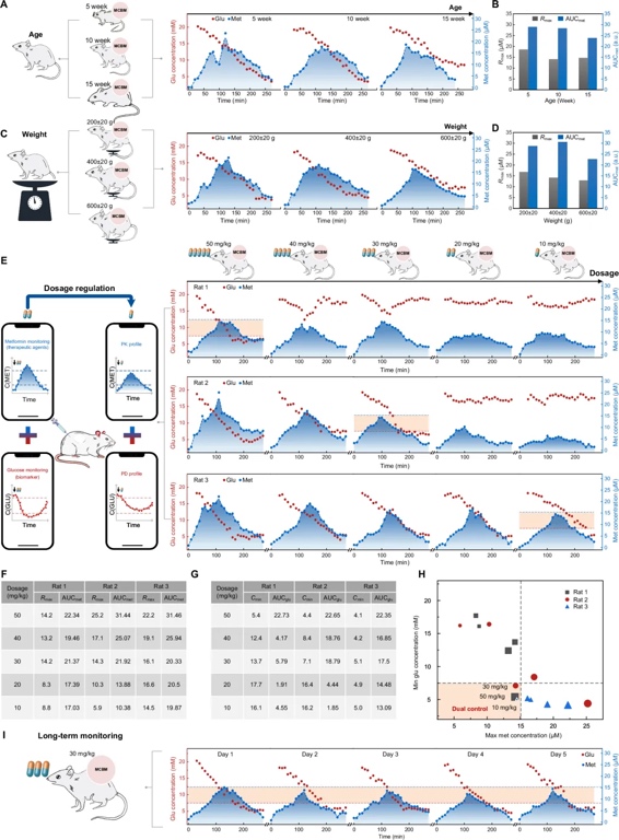 在深入研究MCBM系统的个体化用药指导潜力时,研究团队进一步评估了大鼠体重与年龄对药物代谢模型的影响(图5)。系统每10分钟监测一次葡萄糖和二甲双胍的体内水平,绘制出个体化药代动力学(PK)曲线。结果显示,不同个体之间的药物吸收量(Rmax)和暴露总量(AUCmet)差异显著,体现了个体基础生理条件对药效的影响,强调了个性化调整药物剂量的重要性。通过设置不同剂量梯度(10~50 mg/kg)进行重复实验,MCBM系统精准捕捉到剂量变化对血糖控制效果及药物毒性边界的影响。高剂量虽降糖迅速,但易引发乳酸中毒等副作用;而低剂量虽安全,但疗效有限。最终,研究通过多维并行坐标图整合PK与PD数据,确定了位于“治疗窗”内兼具安全性与疗效的最优剂量方案。连续五次给药测试验证了该剂量具备良好的“葡萄糖-药物”双控制能力,充分展示出MCBM系统在个体化用药指导中的应用潜力,为糖尿病精准治疗提供了强有力的技术支撑。