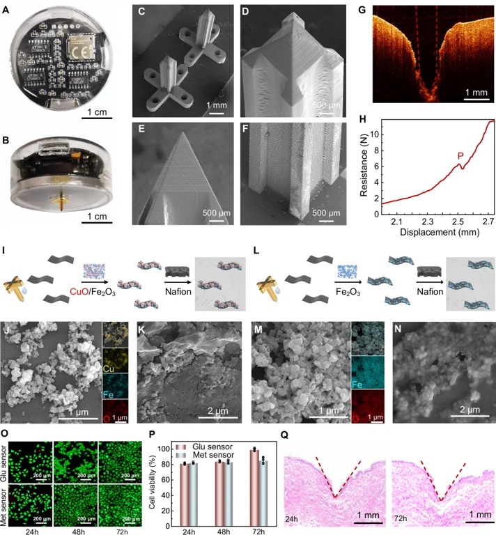为了实现微创、精准、可靠的连续监测功能,本研究基于摩方微纳3D打印技术,构建了一款集成式微针传感系统(MCBM)。该设备整体尺寸仅为直径40 mm、高度12 mm,由3D打印微针电极、可充电锂电池、电路板、定制适配器及可替换针帽组成,组装便捷,便于后续更换传感探头。微针表面通过磁控溅射镀金,使绝缘树脂具备优良导电性,并在其四面集成四个微通道,成功构建出双通道四电极检测系统,实现葡萄糖与二甲双胍的同步监测。微针尖端直径仅约14.2 μm,可轻松穿透皮肤达1.25 mm深度,具备良好的垂直强度和抗剪能力,运动中不易断裂。传感材料方面,采用分层包覆的纳米酶固定策略,有效提升酶层稳定性与传感性能。实验证明,MCBM微针传感器在植入后依旧保持高灵敏度和良好重复性,具备长期监测能力。同时,其生物相容性检测结果表明,该系统对细胞生长无明显抑制,植入皮肤后未见炎症反应,显示出良好的生物安全性,适合进行体内长期连续监测(图2)。