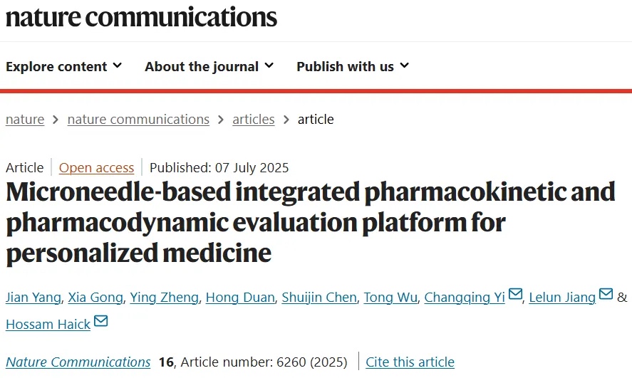 近期,中山大学蒋乐伦/易长青教授团队联合以色列理工学院Hossam Haick教授开发出一款全新的可穿戴式微针系统(MCBM),突破性地实现了对抗糖尿病药物——二甲双胍及其靶向生物标志物——葡萄糖的同步、连续监测。该工作以“Microneedle-based Integrated Pharmacokinetic and Pharmacodynamic Evaluation Platform for Personalized Medicine”为题发表在《Nature Communications》期刊上。南华大学电气工程学院杨健副教授,中山大学深圳校区生物医学工程学院硕士生龚霞,博士生郑颖和为论文的共同第一作者。系统核心组件是基于摩方精密面投影微立体光刻(PμSL)技术(nanoArch® S140,精度:10 μm)制备的双传感微针(图1),融合纳米酶传感界面与微通道结构,具备优异的检测灵敏度与快速响应能力。这项微针设计不仅显著提升了检测效率,也充分体现了复杂结构3D打印技术在高性能可穿戴医疗设备中的关键价值。MCBM系统可无创采集皮肤间质液中的药物与生物信息,结合手机App进行无线数据分析,真正实现了以药效学为导向的治疗闭环,为糖尿病的个体化管理提供了新路径。
