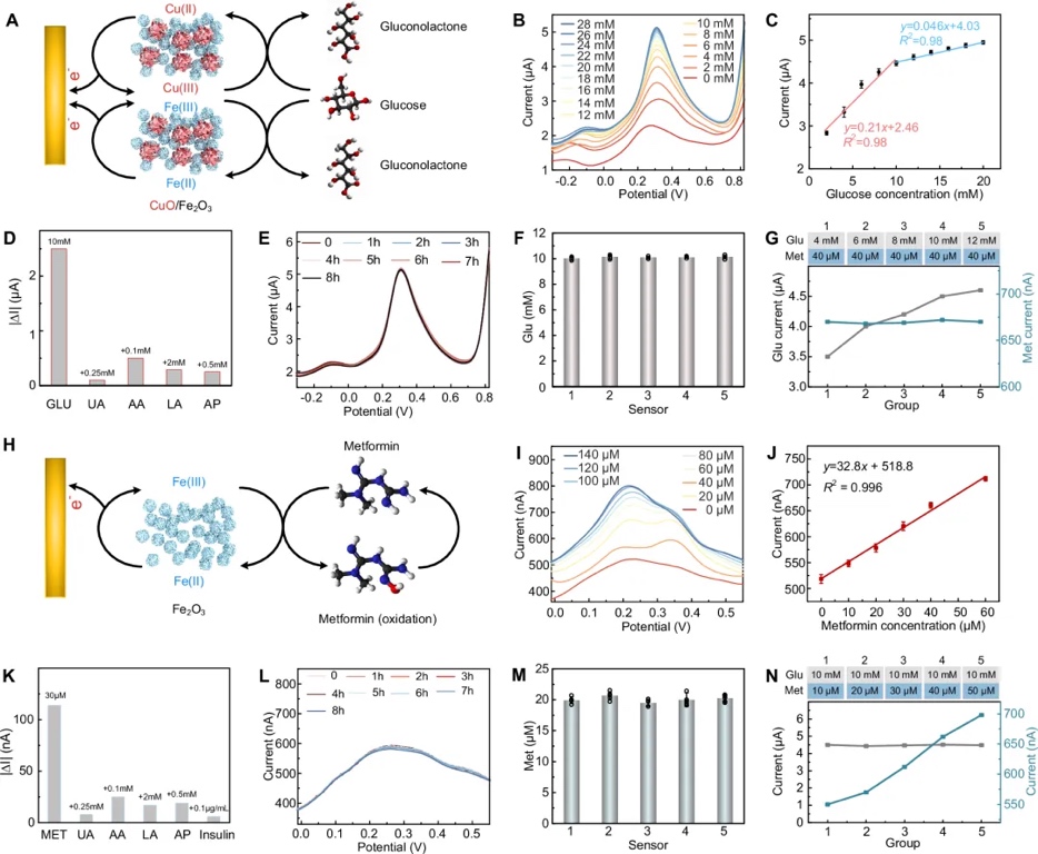 为了验证MCBM系统中微针双传感器的性能,研究团队对葡萄糖和二甲双胍传感器分别进行了体外电化学评估。通过优化纳米酶材料的浓度和比例,显著提升了两者的灵敏度和选择性。葡萄糖传感器基于Fe₂O₃/CuO复合材料,展现出0–28 mM的宽动态检测范围,覆盖大部分糖尿病患者的血糖水平区间,同时对常见干扰物如维生素C、尿酸等具备良好的抗干扰能力。传感器响应稳定,8小时内信号波动极小,重复性RSD仅为3.4%。二甲双胍传感器以Fe₂O₃为活性材料,检测范围达0–140 µM,在临床浓度范围内表现出良好线性(R²=0.996)。同样具备优异的抗干扰性和信号稳定性,RSD为4.5%。此外,双传感器在同时检测两种分子的过程中无明显信号串扰,可实现实时、准确的双指标联动分析。这一成果为后续体内连续药效追踪与个体化用药调整奠定了坚实基础(图3)。