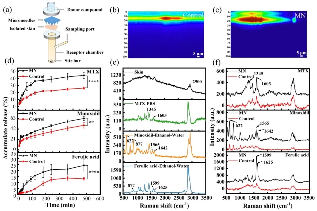 通过Franz扩散池和拉曼光谱,研究微针对药物透皮递送的作用,结果显示微针能显著增强多种药物的渗透。